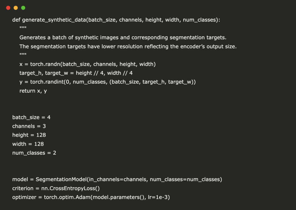 We define a synthetic data generator that produces random images and corresponding low-resolution segmentation targets to match the encoder’s output resolution. Then, we set up and train the segmentation model for 100 iterations using cross-entropy loss and the Adam optimizer. Loss values are printed every 10 iterations to monitor training progress.