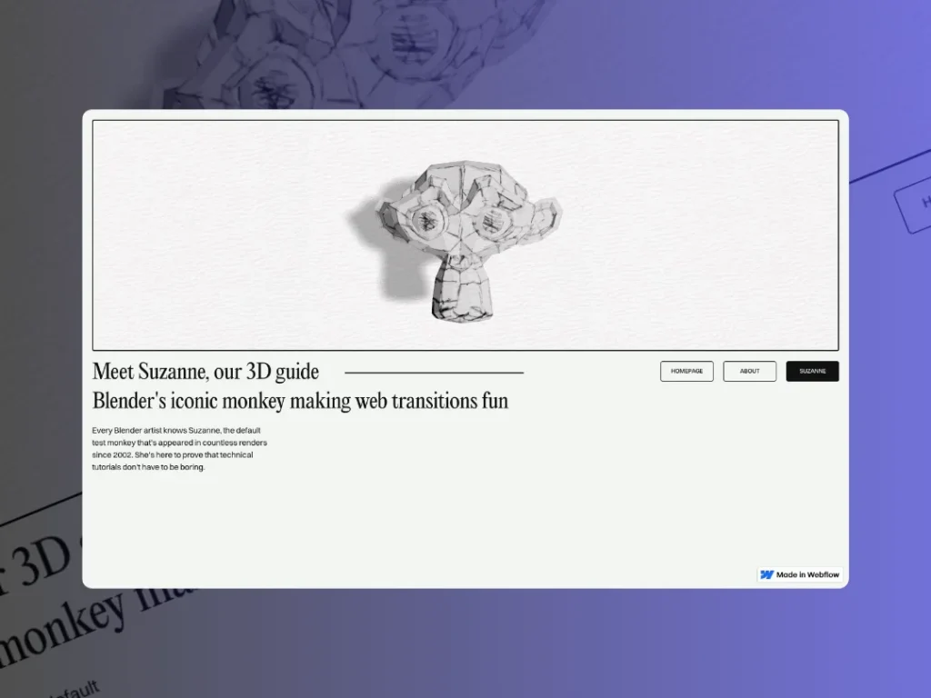 I’ve also been wanting to experiment with a specific hand-drawn 3D style for a while and thought I’d take this tutorial as an opportunity to finally try it. So the goal here is to transform a Webflow site into a gallery-style experience: a persistent 3D scene that never reloads, smooth page transitions, and animations that make navigation feel like moving through a single space rather than jumping between pages.