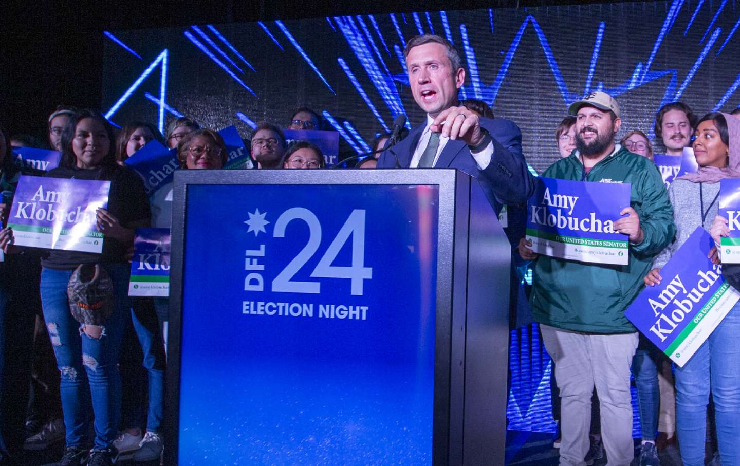 Ken Martin, then the chair of the Minnesota DFL party and now the chair of the DNC, introduces Amy Klobuchar to an election watch party in Saint Paul, Minnesota, on November 5, 2024.