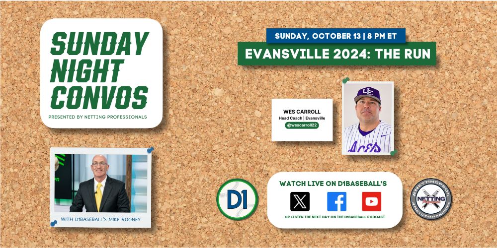 Welcome back to Sunday Night Conversations with D1Baseball’s Mike Rooney! On this episode, Roons is joined by Evansville head coach Wes Carroll to discuss the history of the program and how it all led to their storybook run in the 2024 NCAA Tournament. They also talk about the impact of the team’s success on the program, the city, and college baseball as a whole.