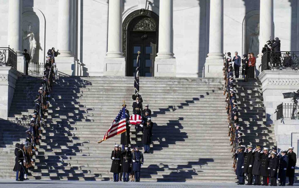 The body of the late former United States president James Earl Carter Jr. is taken from the United States Capitol after lying in state in the Capitol Rotunda on January 9, 2025, in Washington, DC.