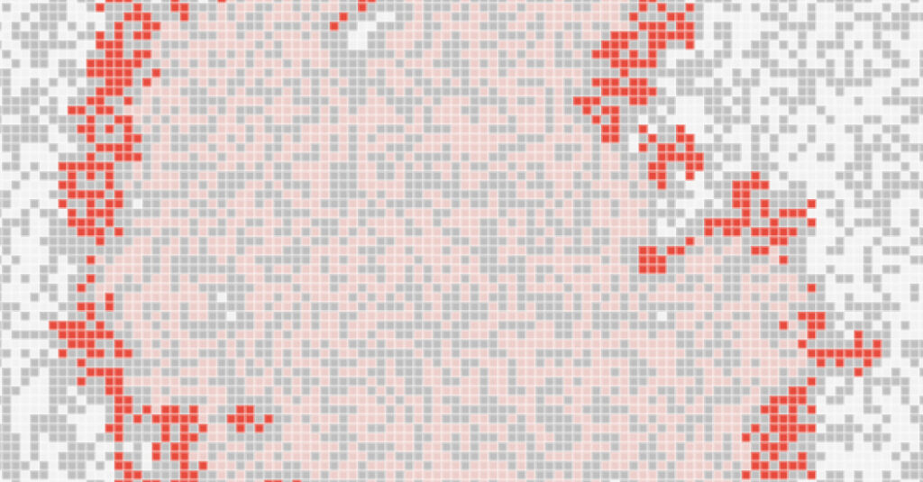 This simulation uses randomness, so the results will turn out somewhat differently every time you play it. But there are patterns that you can discover: When the vaccination level is below around 40 percent, outbreaks are very likely. Above that level, theyâre quickly extinguished.