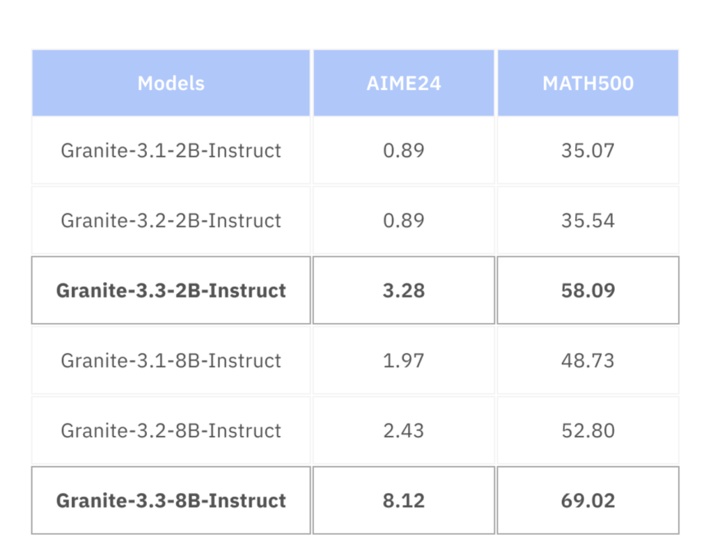 In symbolic reasoning, Granite 3.3 Instruct shows improved accuracy on the MATH500 benchmark, outperforming comparable models at the 8B parameter scale. The RAG-specific LoRA and aLoRA adapters demonstrate enhanced retrieval integration and grounding, which are critical for enterprise applications involving dynamic content and long-context queries.