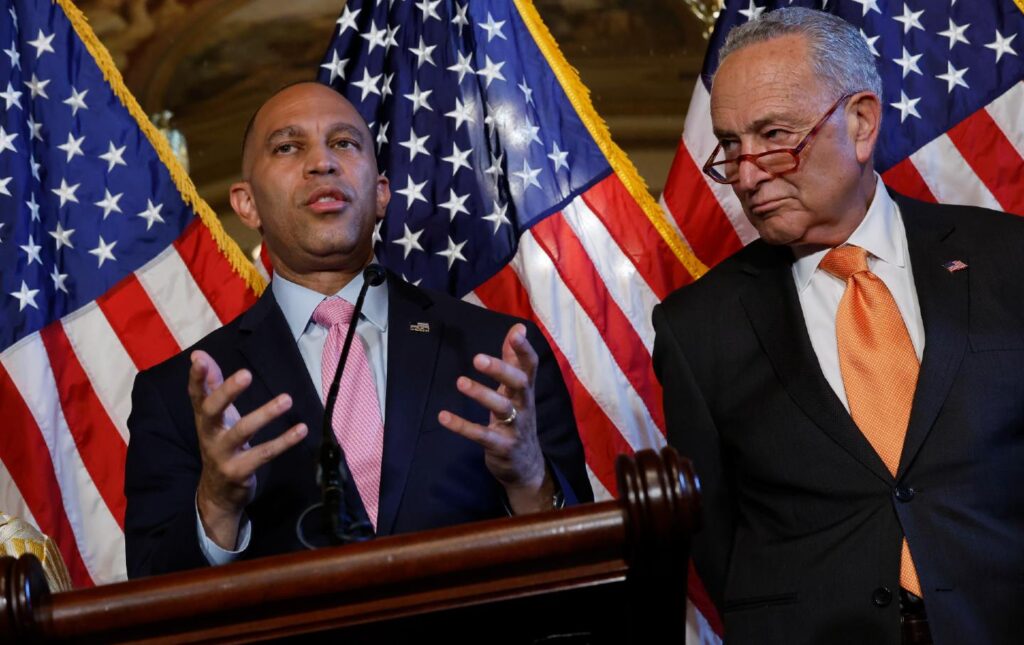 House minority leader Hakeem Jeffries (D-NY) (L) and Senate majority leader Chuck Schumer (D-NY), join fellow congressional Democrats to reintroduce the Freedom to Vote Act in the Lyndon B. Johnson Room at the US Capitol on July 18, 2023 in Washington, DC.