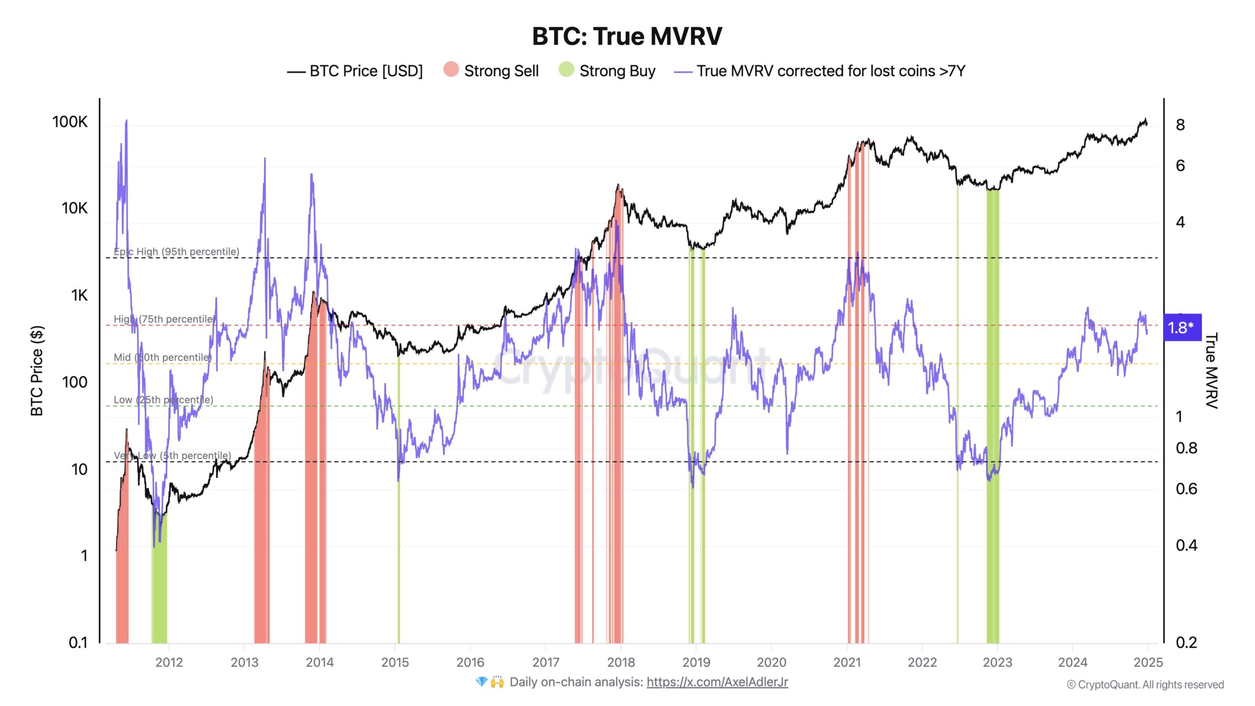 If the current cycle is going to show anything similar to the previous ones, then the True MVRV being high, but not extremely high, could potentially suggest room for BTC left in the current bull run.