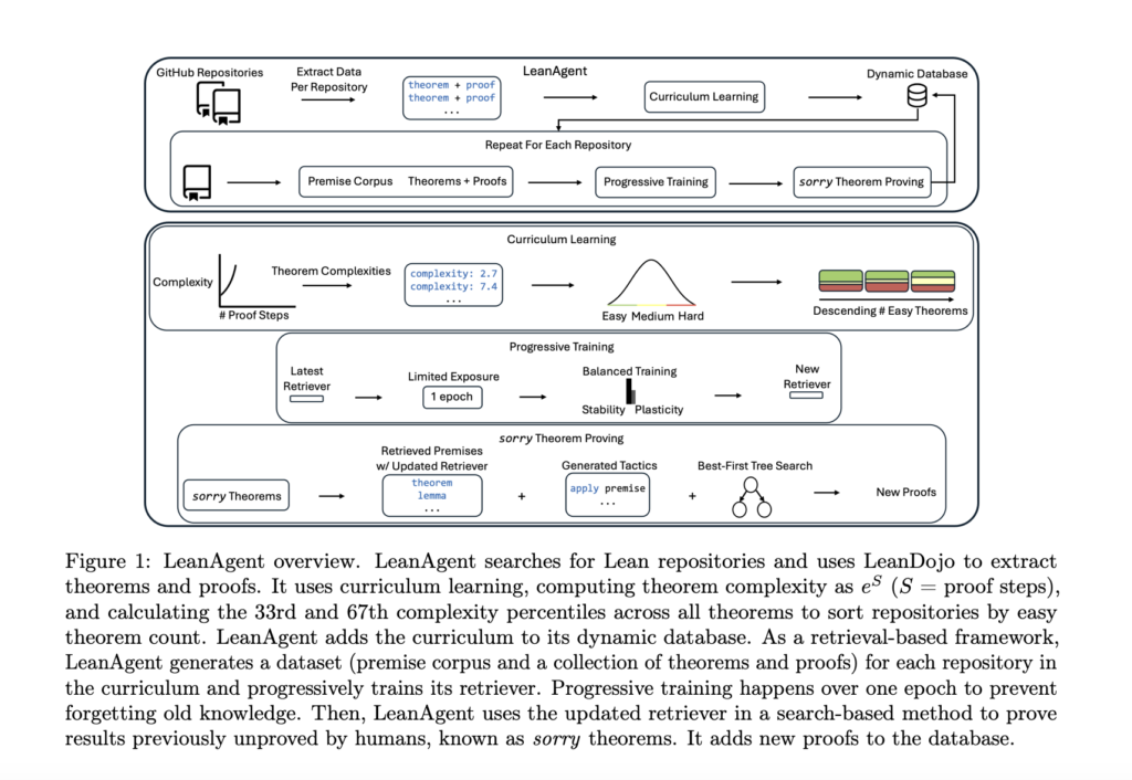 Researchers from California Institute of Technology, Stanford, and University of Wisconsin, Madison introduce LeanAgent, a lifelong learning framework designed for formal theorem proving. LeanAgent addresses the limitations of existing LLMs by introducing a dynamic approach that continually builds upon and improves its knowledge base. Unlike static models, LeanAgent operates with a dynamic curriculum, progressively learning and adapting to increasingly complex mathematical tasks. The framework incorporates several key innovations, including curriculum learning to optimize the learning trajectory, a dynamic database to efficiently manage expanding mathematical knowledge, and a progressive training methodology designed to balance stability (retaining old knowledge) and plasticity (incorporating new knowledge). These features enable LeanAgent to continually generalize and improve its theorem-proving abilities, even in advanced mathematical domains such as abstract algebra and algebraic topology.