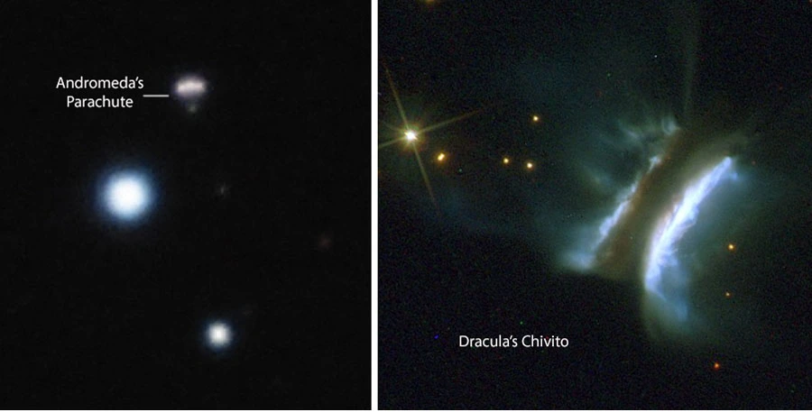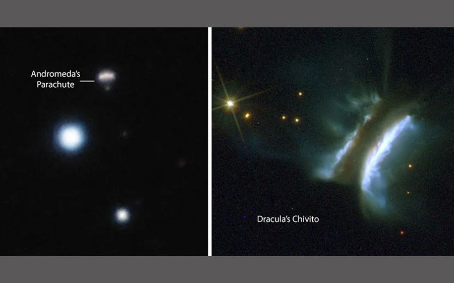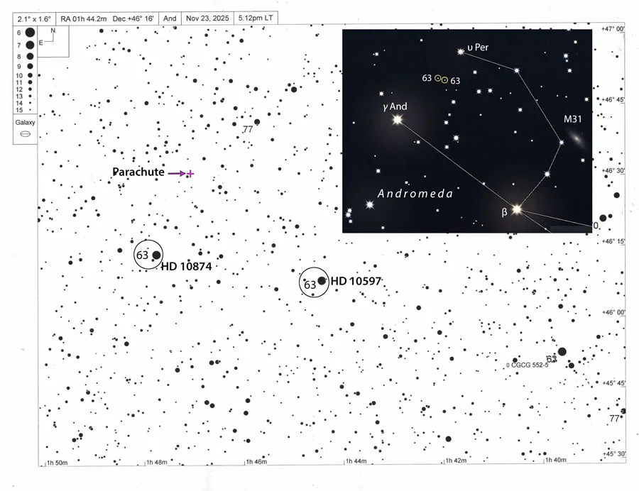 This summer, I learned about two deep-sky objects that I had to observe as soon as I saw their names — Andromeda’s Parachute and Dracula’s Chivito. The former is a quadruple gravitationally lensed quasar discovered in 2017 and shaped like a tiny, descending parachute. Three of the images outline an inflated chute, and the fourth represents a capsule suspended below it. Kate Rubin (San Diego State University) and her team chose the name in their 2018 Astrophysical Journal paper to recognize the role of parachute systems in space missions. Formally, the object goes by the more sober moniker J014710+463040.