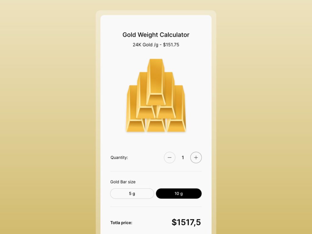 In the controls section, we added plus and minus buttons to set the number of gold bars. These are simple layouts with icons inside. Below them, there are two buttons to switch between 5g and 10g options. They’re styled as rounded layouts with text inside.