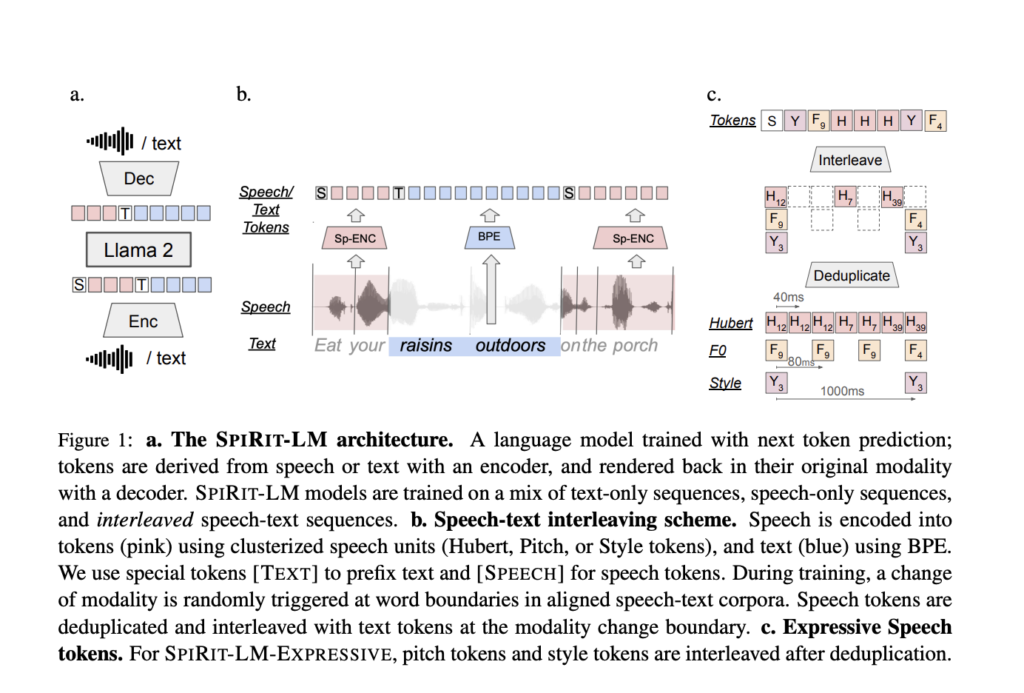 Meta Spirit LM employs a unique word-level interleaving method to train on a mix of text and speech datasets. The modelās architecture is designed to freely transition between text and speech by encoding both modalities into a single set of tokens. Spirit LM Base utilizes phonetic tokens derived from speech representations, whereas Spirit LM Expressive incorporates pitch and style tokens that add layers of expressivity, such as tone or emotional nuances.