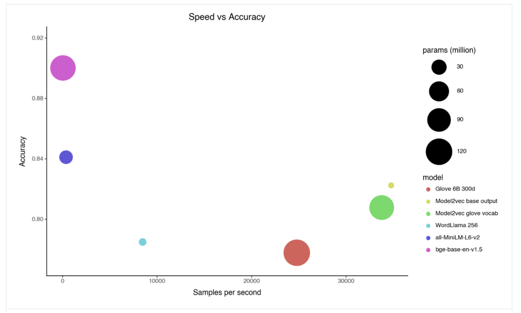 Model2Vec models were shown to be competitive with state-of-the-art models like all-MiniLM-L6-v2 while being significantly smaller and faster. The speed advantage is particularly noteworthy, with Model2Vec models offering classification performance comparable to larger models but at a fraction of the computational cost. This balance of speed and performance makes Model2Vec a great option for developers looking to optimize both model size and efficiency.