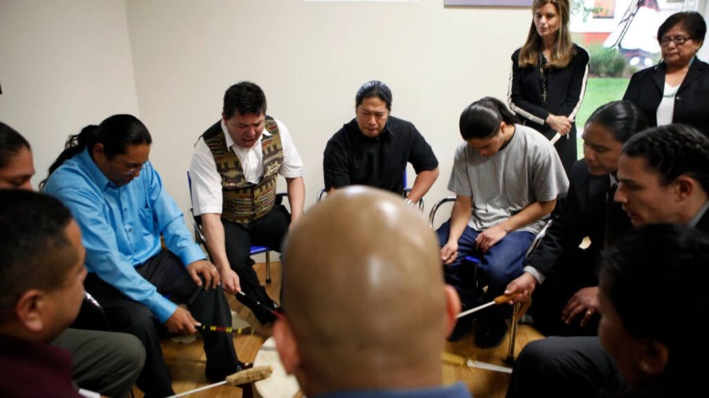 A drumming circle at the Friendship House in San Francisco. Friendship House is a Native-led recovery treatment program that provides culturally relevant care.