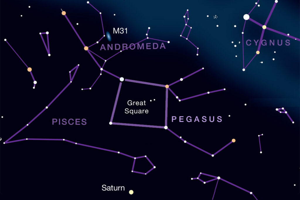Look above Saturn, by two or three fists, for a very large box of four stars that are roughly the same medium brightness. This simple pattern is known the world over as the Great Square of Pegasus, and it forms the body of this famous mythical horse. But this horse is weird! It’s flying upside down (as seen from the Northern Hemisphere), and it has no hindquarters.