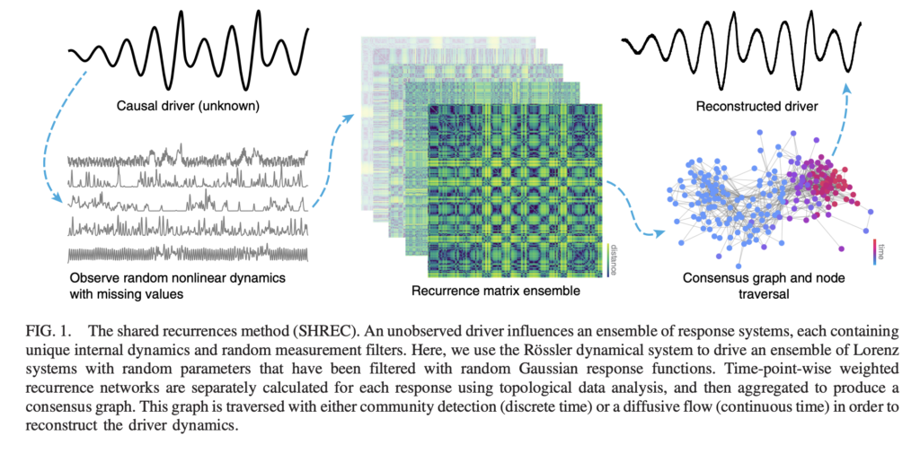 The researchers from The University of Texas introduce a physics-based unsupervised learning framework called SHREC (Shared Recurrences) to reconstruct causal drivers from time series data. The approach is based on the theory of skew-product dynamical systems and topological data analysis. Innovation includes the use of recurrence events in time series to infer common causal structures between responses, the construction of a consensus recurrence graph that is traversed to expose the dynamics of the latent driver, and the introduction of a new network embedding that adapts to noisy and sparse datasets using fuzzy simplicial complexes. Unlike the existing methods, the SHREC framework well captures noisy and nonlinear data, requires minimal parameter tuning, and provides useful insight into the physical dynamics underlying driver-response systems.