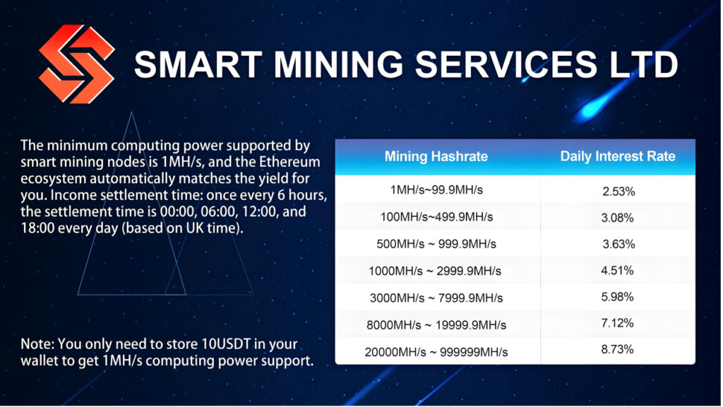 Smart Mining was established in 2020 and has attracted 10 million users worldwide, supporting the mining of Bitcoin and multiple cryptocurrencies. Its AI management system optimizes the status of the mining pool in real time, ensures 100% operation rate, and helps users achieve passive income. Users only need to deposit more than $10 in their trust wallet to start making profits.