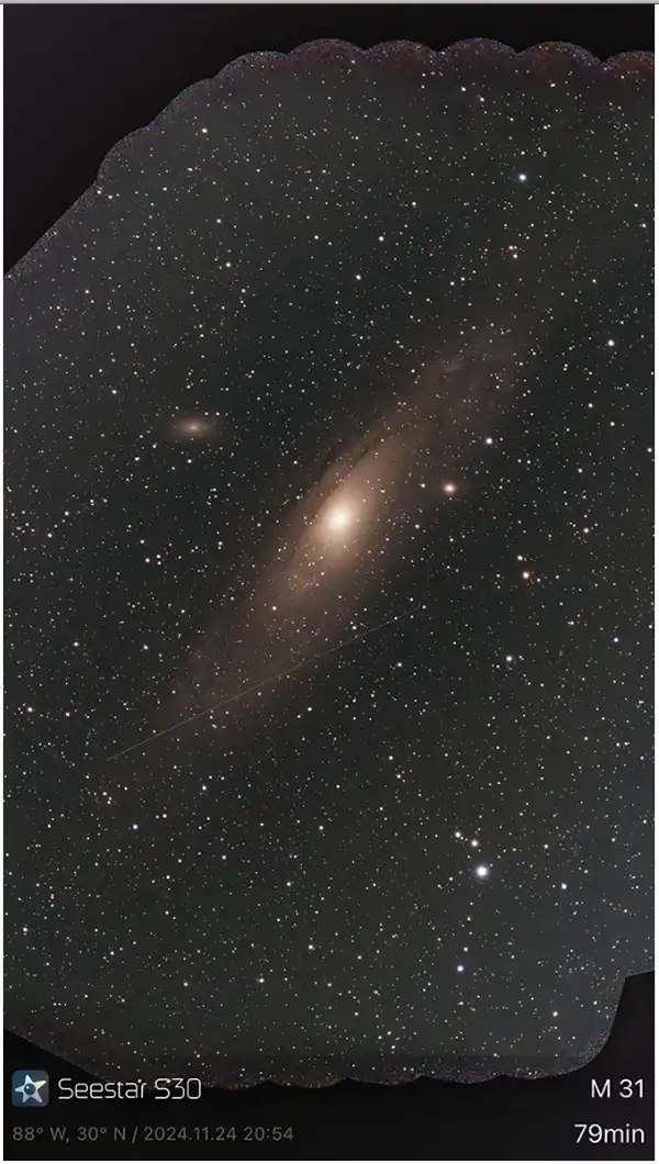 The Seestarâs 1.2° Ă 2.4° field of view is adequate for most large objects, but what about really big ones like M31, the Andromeda Galaxy? The S30 fit it into the frame when the galaxy is properly orientated with respect to the scopeâs rectangular field. It would be nice to place some dark sky around it, though. Shortly after I began testing, there was an update to the app which added a feature called Framing to the SkyMap.