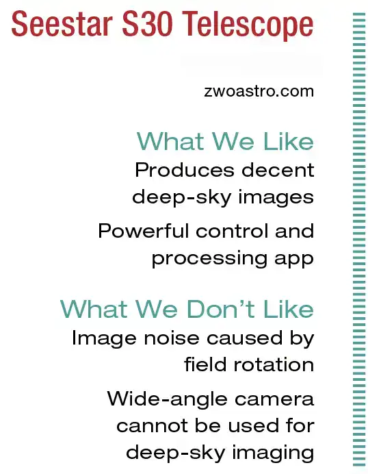 No telescope is perfect, including this impressive little device. One minor issue I experienced was image noise resulting from field rotation. Unless you live at the North or South Pole, stars move in arcs across the sky. An equatorially mounted telescope can follow these arcs, but an alt-azimuth one like the S30 cannot. Instead, it must take short exposures and rotate each frame electronically as it stacks them together so stars donât trail. This works, but in longer exposures it causes noise to appear at the corners of the image, where there is little or no overlap between sub-exposures. The easiest cure for this is cropping combined with the Intelligent Denoise feature. ZWO recently announced that an equatorial mode is in the works.