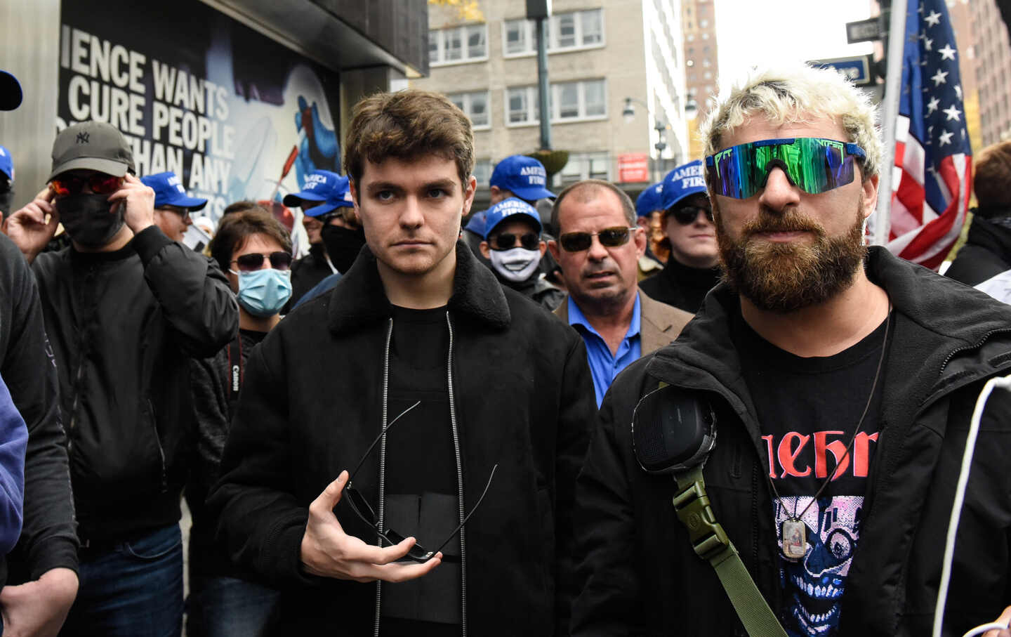 Nick Fuentes with livestreamer and January 6 insurrectionist Baked Alaska at an anti-vaccine protest with members of the far-right group America First in front of Pfizer world headquarters on November 13, 2021, in New York City.