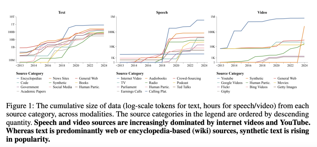 - Over 70% of speech and video datasets are derived from web platforms like YouTube, while synthetic sources are becoming increasingly popular, accounting for nearly 10% of all text data tokens.