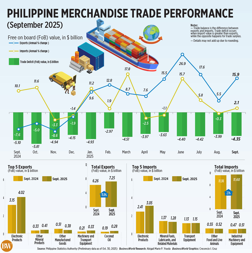 Total outbound sales of Philippine-made goods climbed by 15.9% year on year in September to $7.25 billion, faster than the 5.5% increase in August and a reversal from the 7.6% drop in September 2024.