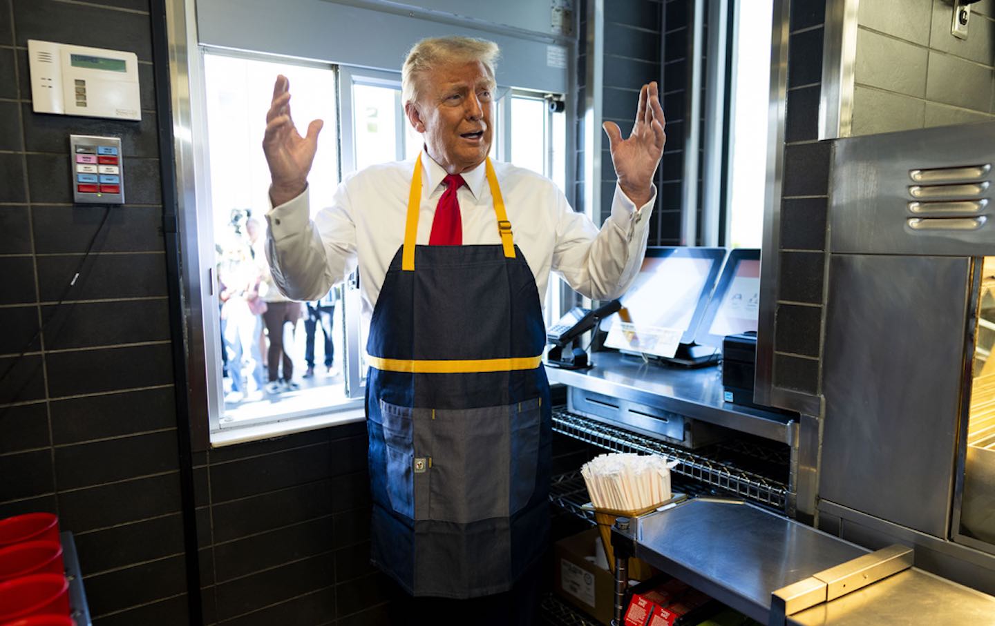 The episode was a Potemkin spectacle—the franchise was actually closed to customers for the photo-op, and the customers Trump pretended to serve were MAGA supporters pre-vetted by the Secret Service; those faux customers even did trial runs through the restaurant’s drive-thru lane in advance of Trump’s star turn. Trump and his team had been touting his appearance over the past week as a means of trolling his Democratic rival, Vice President Kamala Harris, who has referred to her own summer job at a Bay Area McDonald’s in 1983 as part of her middle-class upbringing. Trump has branded Harris’s claim a lie without offering any evidence for disbelieving it—so when his stint behind the fryers was over, he bragged that he’d worked at McDonald’s 15 minutes longer than Harris has.