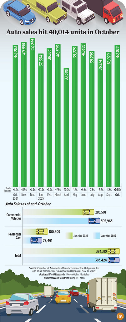 A joint report by the Chamber of Automotive Manufacturers of the Philippines, Inc. (CAMPI) and the Truck Manufacturers Association (TMA) showed new vehicle sales inched up by 0.03% or 11 units to 40,014 in October from 40,003 units in the same month a year ago.