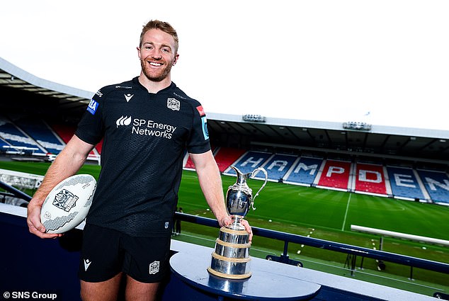 Glasgow captain Kyle Steyn poses with the URC trophy at Hampden